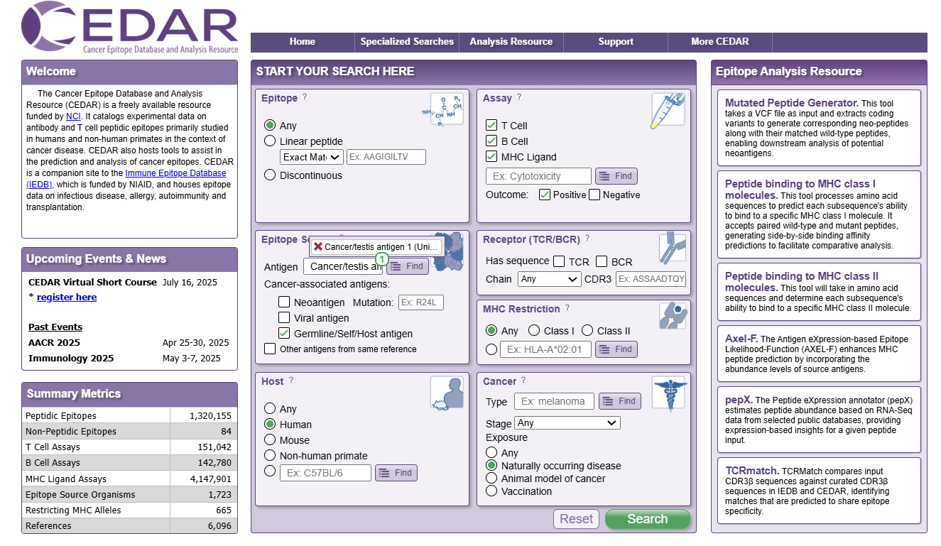 Users can narrow down their query to only include epitopes tested in a specific clinical and/or immunological context using the ‘Cancer’ panel. A cancer type can be selected by typing it into the text box, where matching cancer types appear in the drop-down menu. In the ‘Disease Finder’, which can be accessed using the finder icon next to the text box, users can search for different cancer types by name or using Disease Ontology (DOID) (34755882.pdf (1.5 MB)) or the Ontology of Immune Epitopes (ONTIE)(22681406.pdf (596.8 KB)) identifiers. One can also explore the ‘Disease Tree’ to select cancer types of interest. In the cancer panel, users can also select a cancer stage they want to query from the drop-down menu. The cancers can further be narrowed down according to how the host was exposed, i.e., ‘Naturally occurring disease’ (e.g., occurrence of breast cancer), ‘Animal model of cancer’ (e.g., C57BL/6 or BALB/c), and ‘Vaccination’ (e.g., therapeutic vaccination with neoantigens or prophylactic vaccination against human papillomavirus (HPV)). In the example query in Figure 1, the ‘Type’ field was left blank to include all cancer types, and ‘Naturally occurring disease’ was selected to only include immune responses that occurred naturally without any intervention.