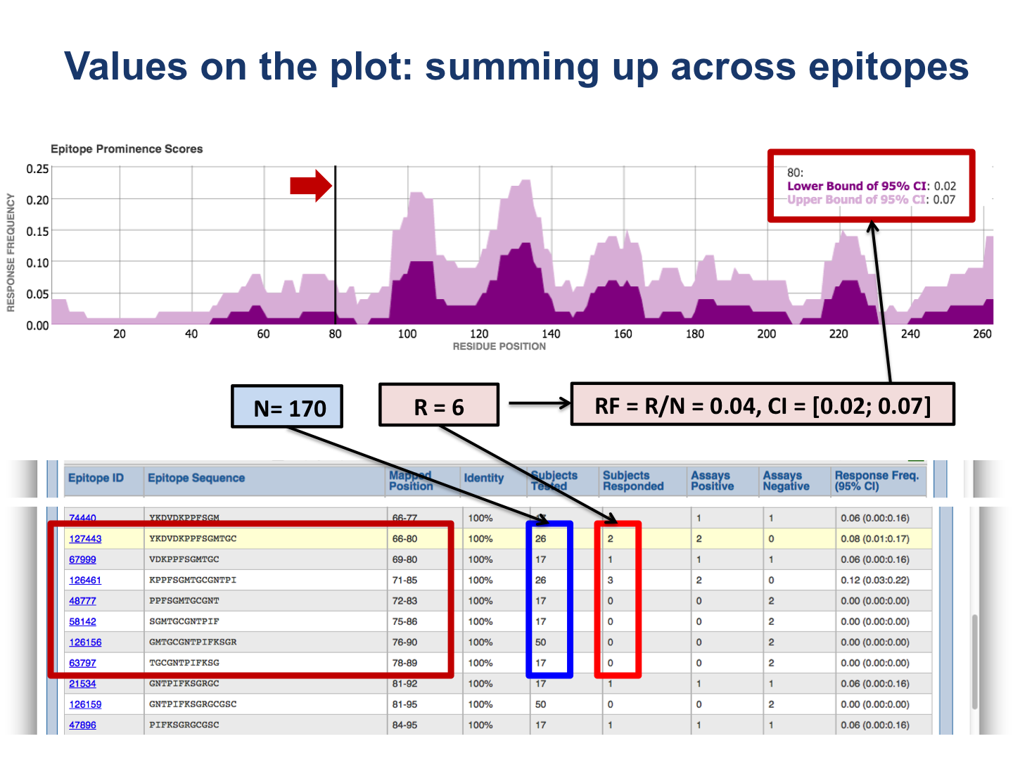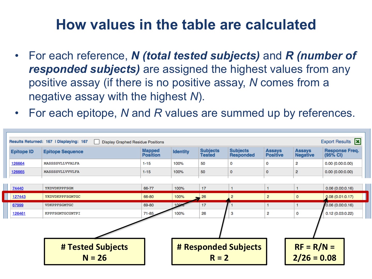 The table presents results for each epitope. The figures below provide explanation how values in the table are calculated.