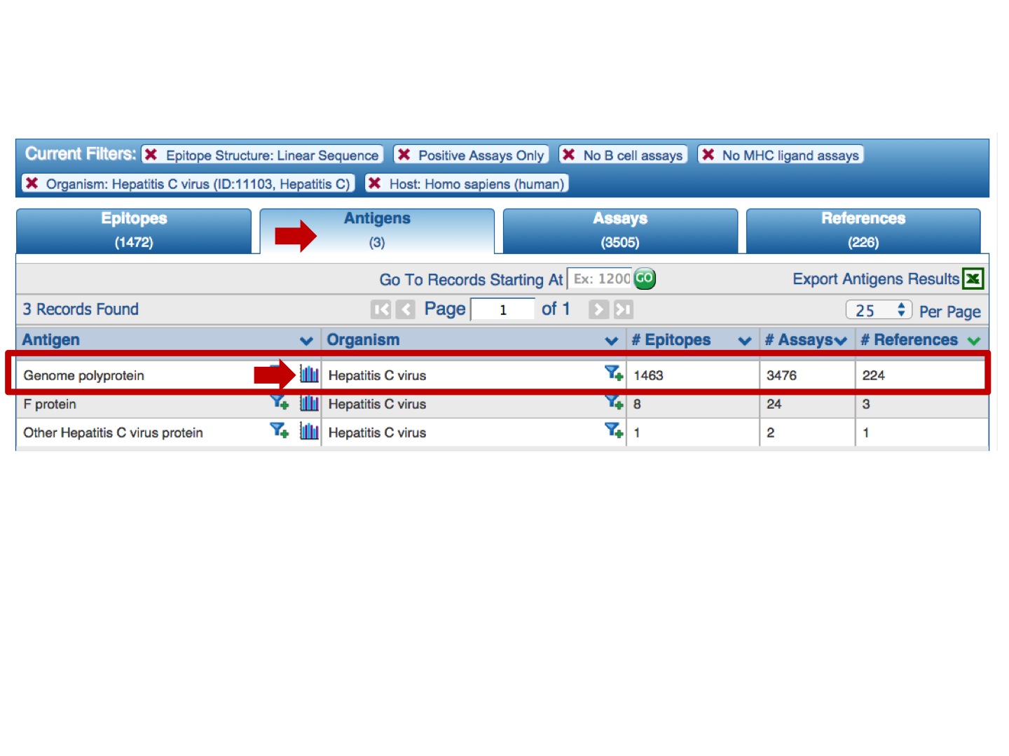 Each selected antigen is considered to be a target protein, and the tool by default maps and visualizes all epitopes in the query result that are from the source antigen which is the target protein or any of its taxonomic child. The mapping is done using the alignment between the source antigen and the target protein and matching the epitope positions in the source antigen with the residue positions in the target protein (* – the default mapping criteria are provided below). Note, by default, epitopes that were tested as negative for the correspondent query will be mapped as well, even if the user queried only for positive assays. Also, the epitopes that failed to satisfy the default mapping criteria won’t be mapped and visualized. Note that if there is no Immunome Browser icon for any Antigen, either the epitopes are non-peptidic or there is no available reference proteome to map the epitopes onto.