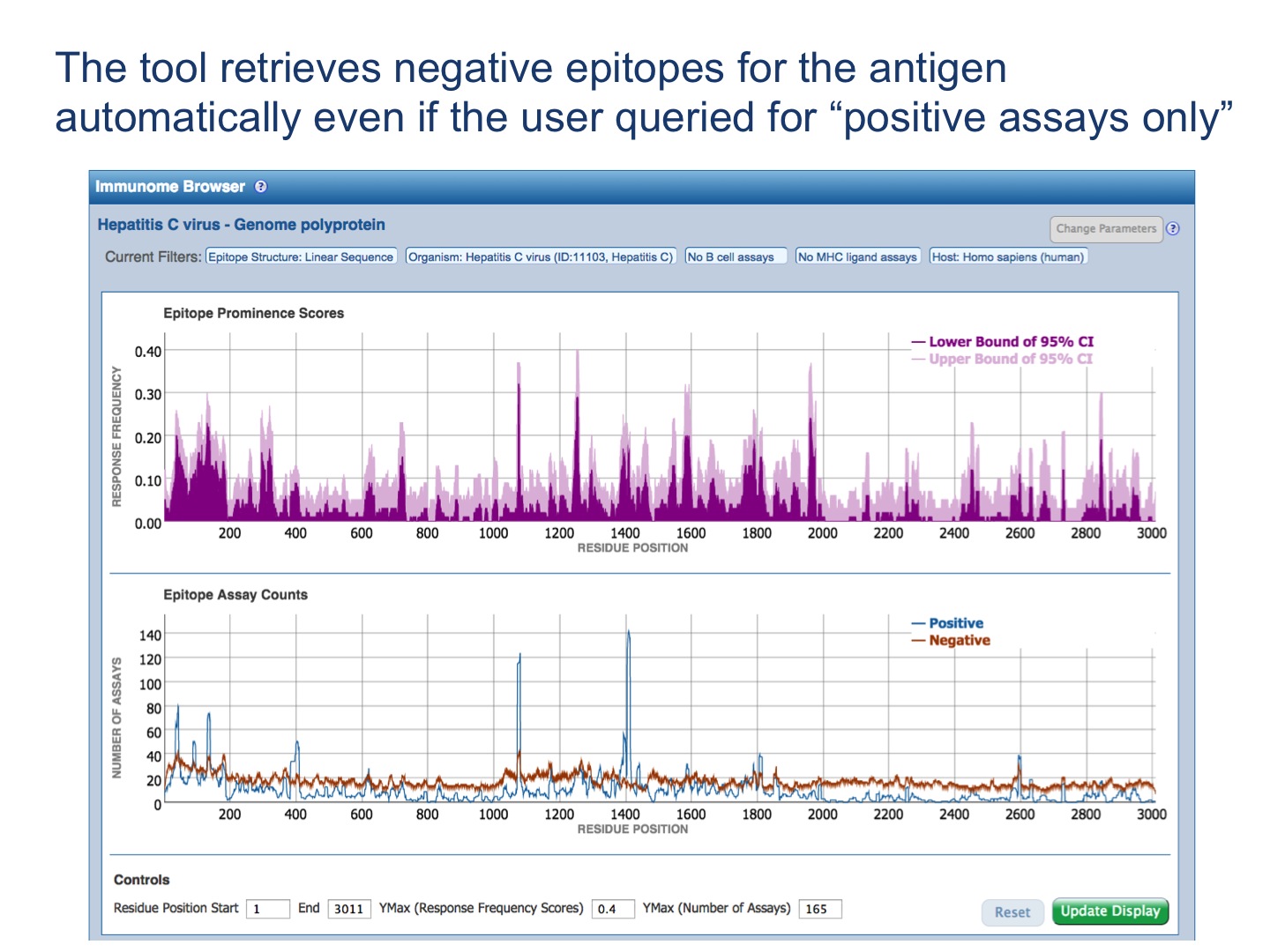 Immunome Browser maps and visualizes queried in IEDB linear peptidic epitopes along the length of a protein sequence (a target, or reference, protein). The purpose of the tool is to allow users exploring how often each protein region has been studied in immune assays and in how many assays the immune response was positive or negative.