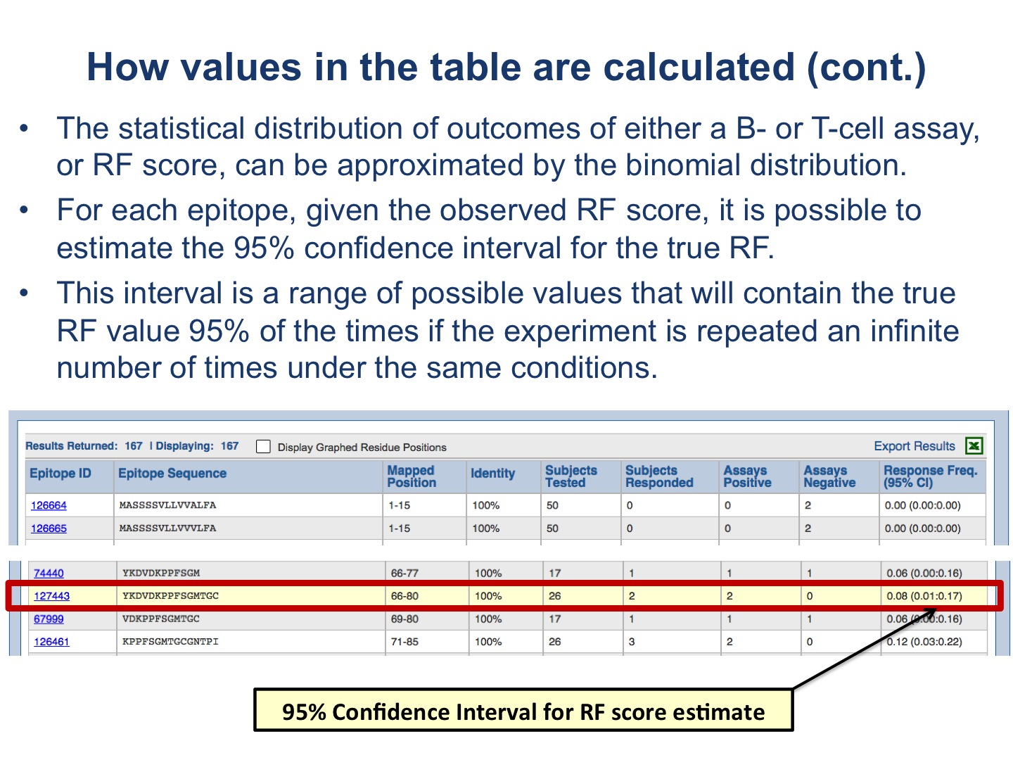 The 95% CI is a range of possible values that will contain the true RF value 95% of the times if the experiment (same epitopes & assays) is repeated an infinite number of times under the same conditions, assuming that the statistical distribution of outcomes of either a B- or T-cell assay can be approximated by the binomial distribution as, in general, the following conditions of experiments are satisfied: (1) an assay is repeated for a fixed number N of tested subjects; (2) each tested subject can show only two possible outcomes (response or no response); (3) the probability of response, or no response, is the same for each subject; and (4) the subjects are statistically independent (see Binomial distribution - Wikipedia ).