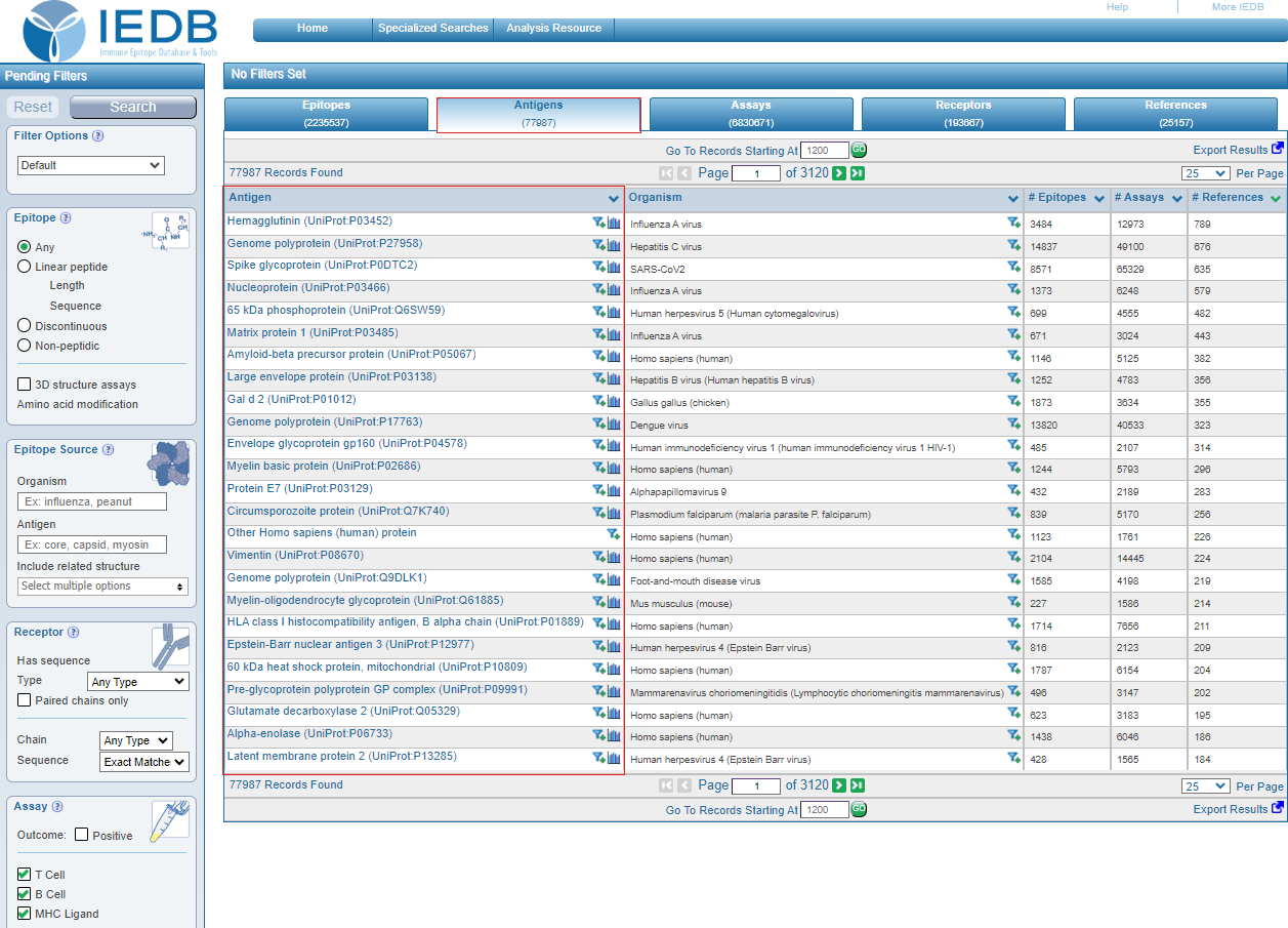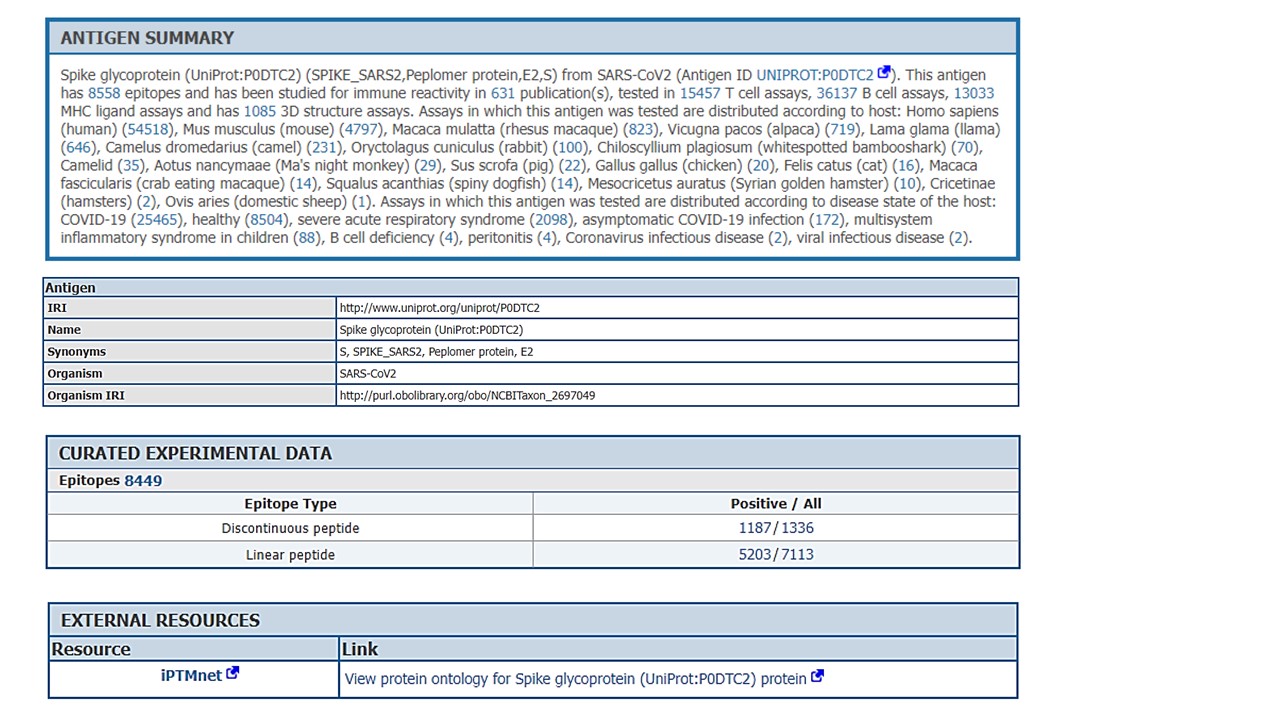 In the IEDB results, you should navigate to the Antigens tab. There, all UniProt antigens have been hyperlinked. By selecting the antigen of your choice, a new web page will open with the information for that antigen.