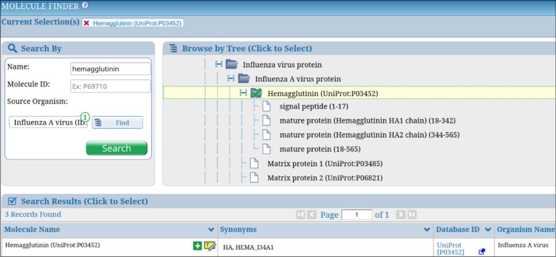 Figure 1. Example of searching Influenza A hemagglutinin in the Molecule Finder.