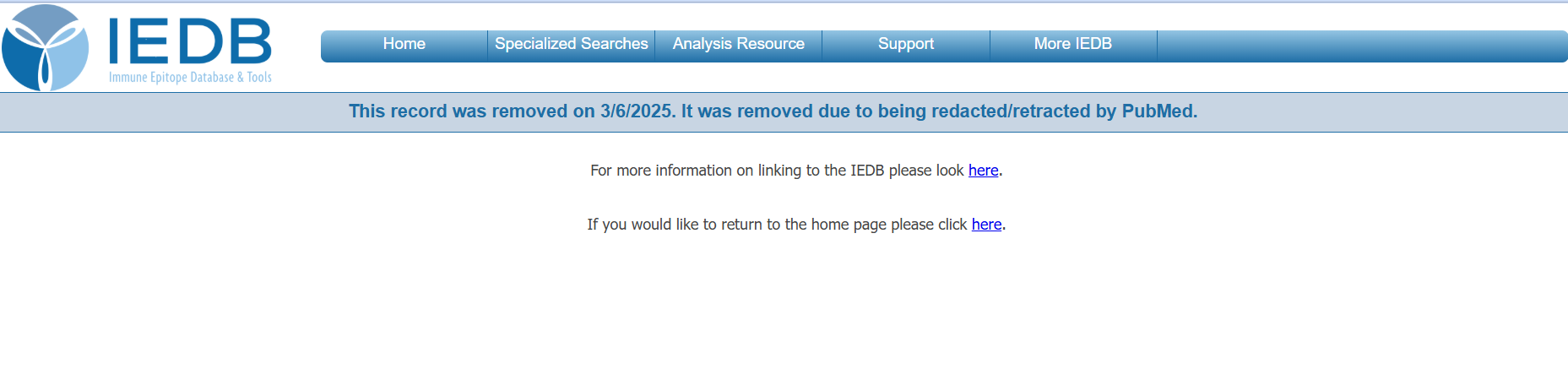 If a user attempts to access this removed reference by the direct link (IEDB Reference 1022457 details), they get the following screen: